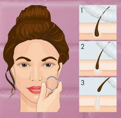 ✅فنر فلزی را روی ناحیه مورد نظر نگه دارید و به آرامی فشار دهید. روی موهای ناخواسته صورت بغلتانید تا پوست صاف و بدون مو شود. از ناحیه چشم دوری کنید.