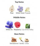 ترکیبی خیال انگیز از عطر گل بنفشه سفید پیچیده در عطر سوسن سفید که در انتها به رایحه چوب سرو ختم میشود