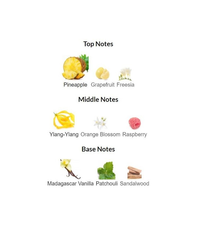 مخلوطی از رایحه چوب صندل سریلانکا, نعناع هندی و وانیل ماداگاسکار به همراه عطر آناناس و گریپ فروت و گلهای پیازدار